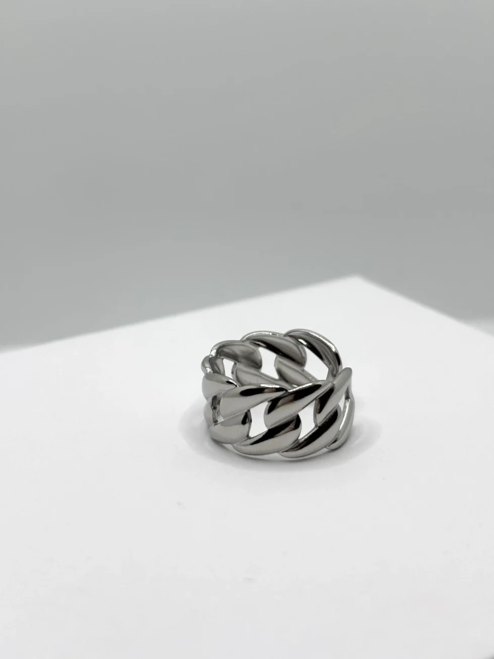 Anello in acciaio inox con design a catena intrecciata, disponibile in finitura argentata o dorata. Un classico rivisitato in chiave moderna, adatto sia a lui che a lei.