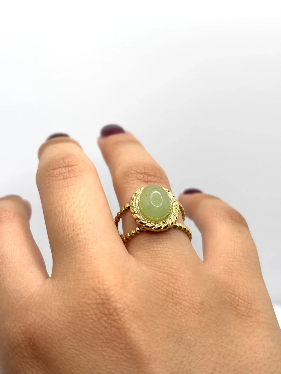 Anello regolabile in acciaio inox dorato con pietra verde ovale, simbolo di armonia e rinascita. Un gioiello elegante e raffinato, ispirato alla purezza della natura.