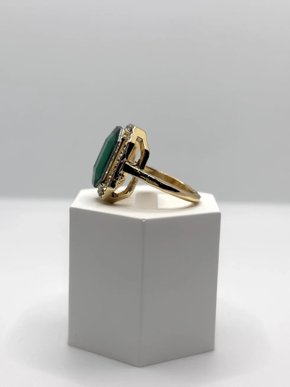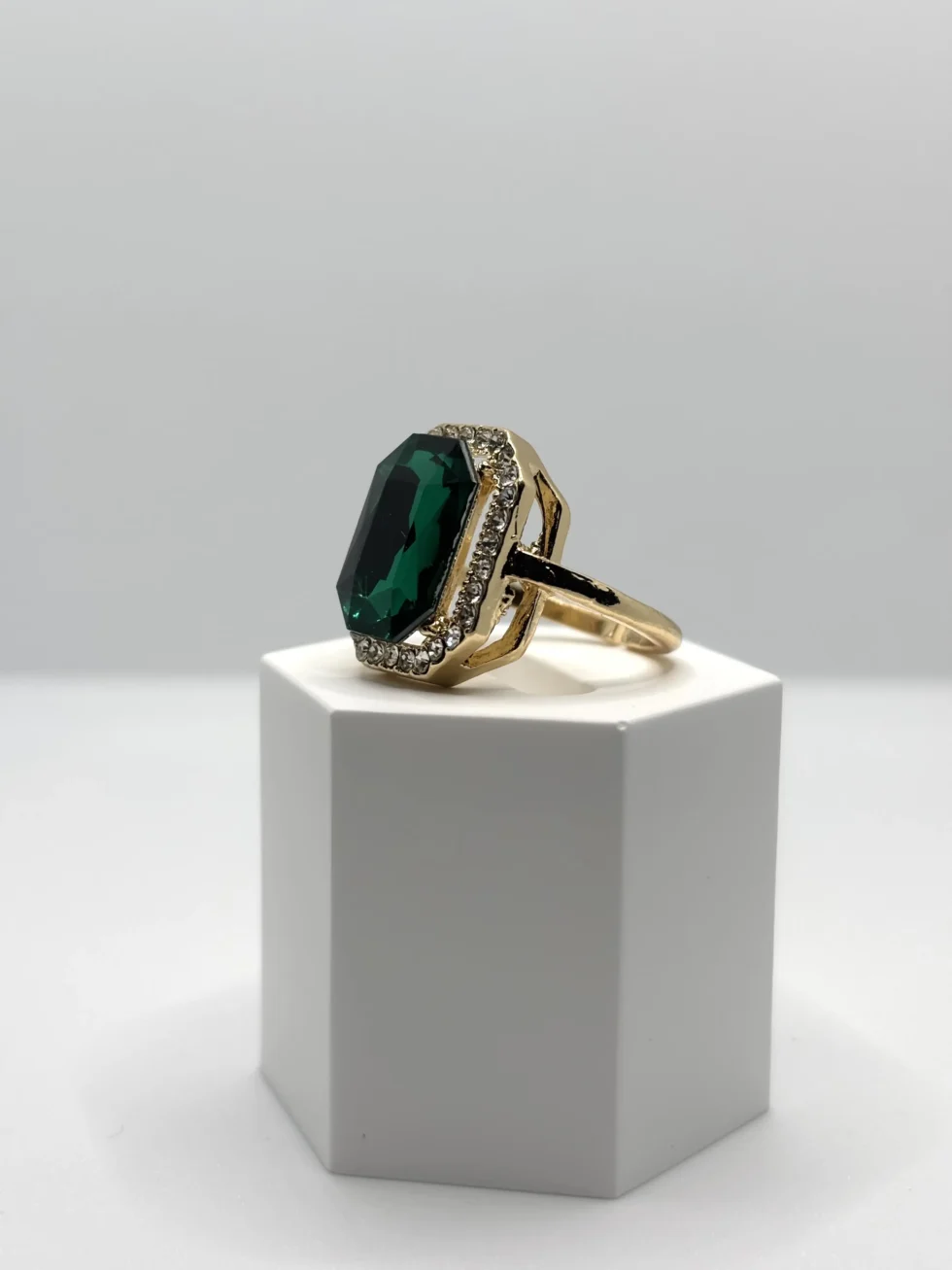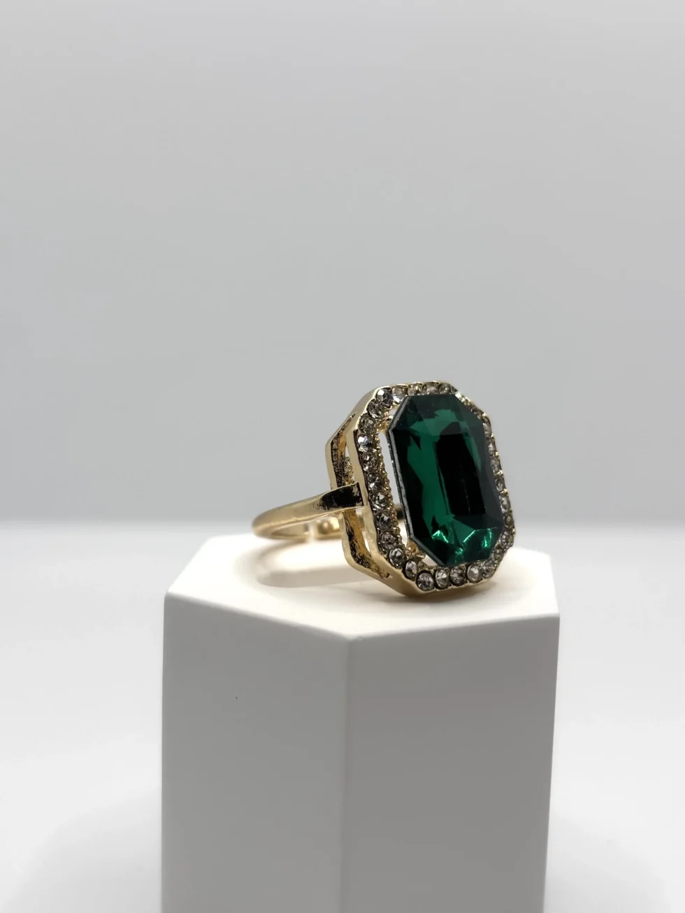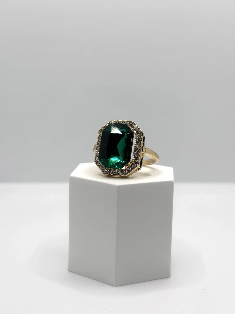 Anello elegante con cristallo verde smeraldo incastonato e cornice di zirconi luminosi. Un design regale che unisce raffinatezza e carattere.