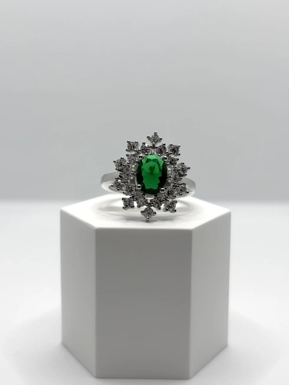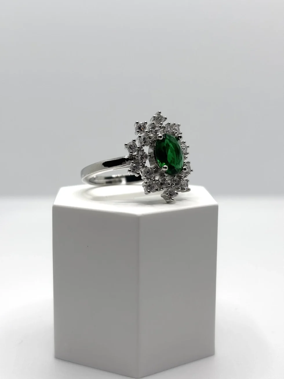 • Pietra: Centrale verde (taglio ovale) + contorno zirconi luminosi