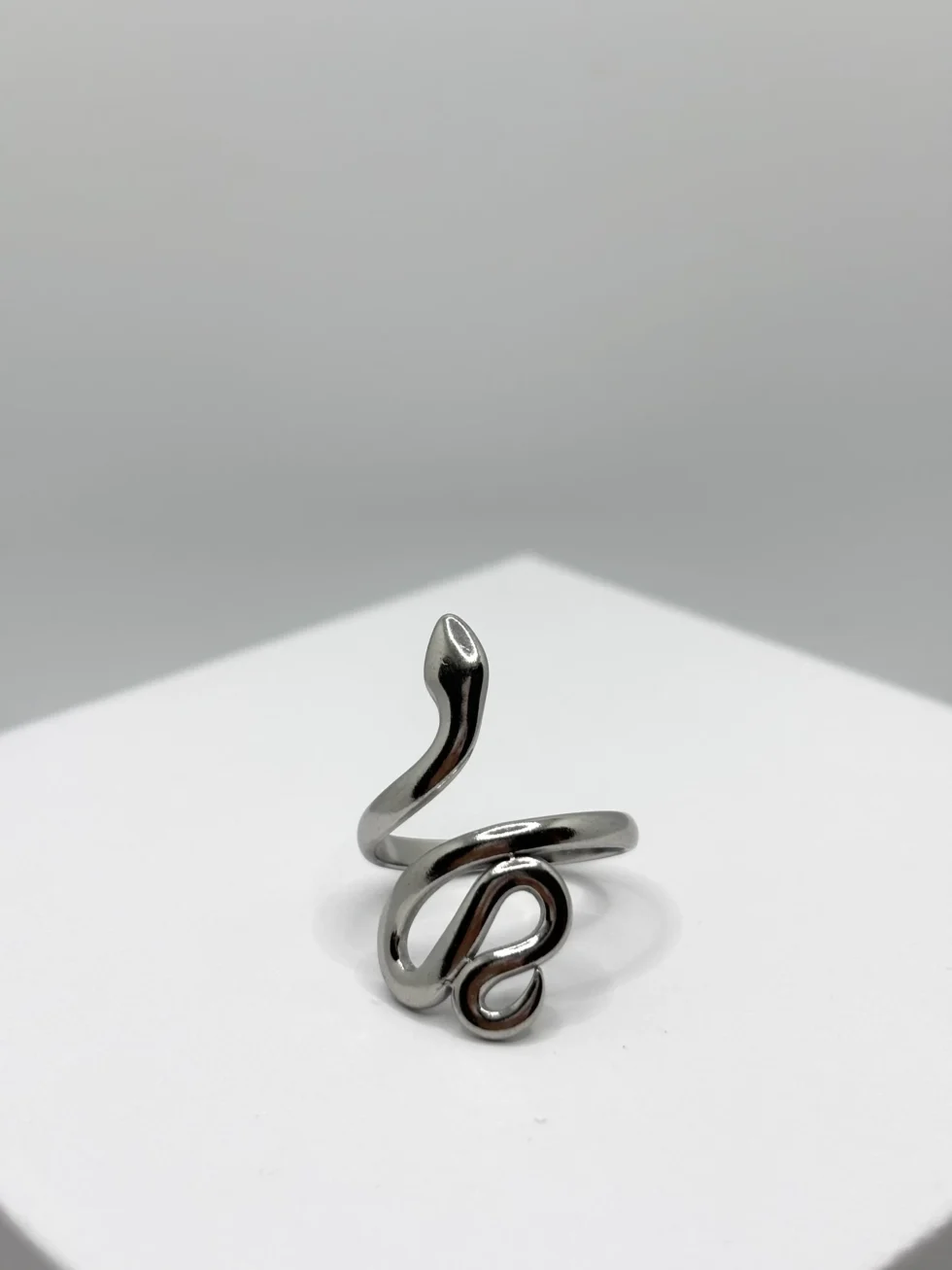 Anello in acciaio inox con design a serpente, disponibile in versione argentata o dorata. Un gioiello dal carattere deciso e simbolico, perfetto per chi ama distinguersi con stile.