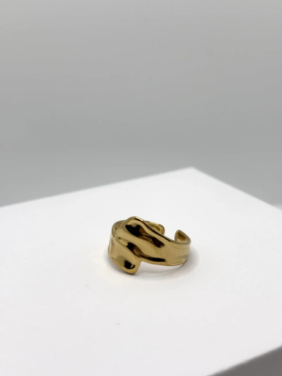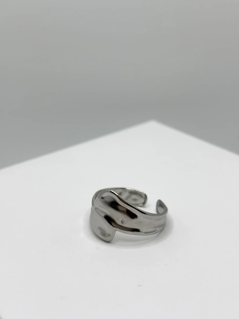 Anello in acciaio inox con design ondulato e finitura lucida, disponibile in argento o oro. Linee morbide e luminose per un look moderno e sofisticato.