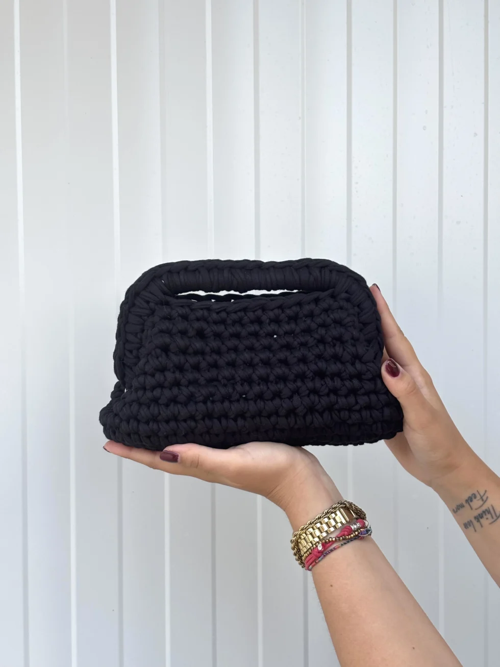 Borsa artigianale in crochet nero, dal design compatto ed elegante. Una creazione esclusiva che unisce stile e lavorazione handmade.