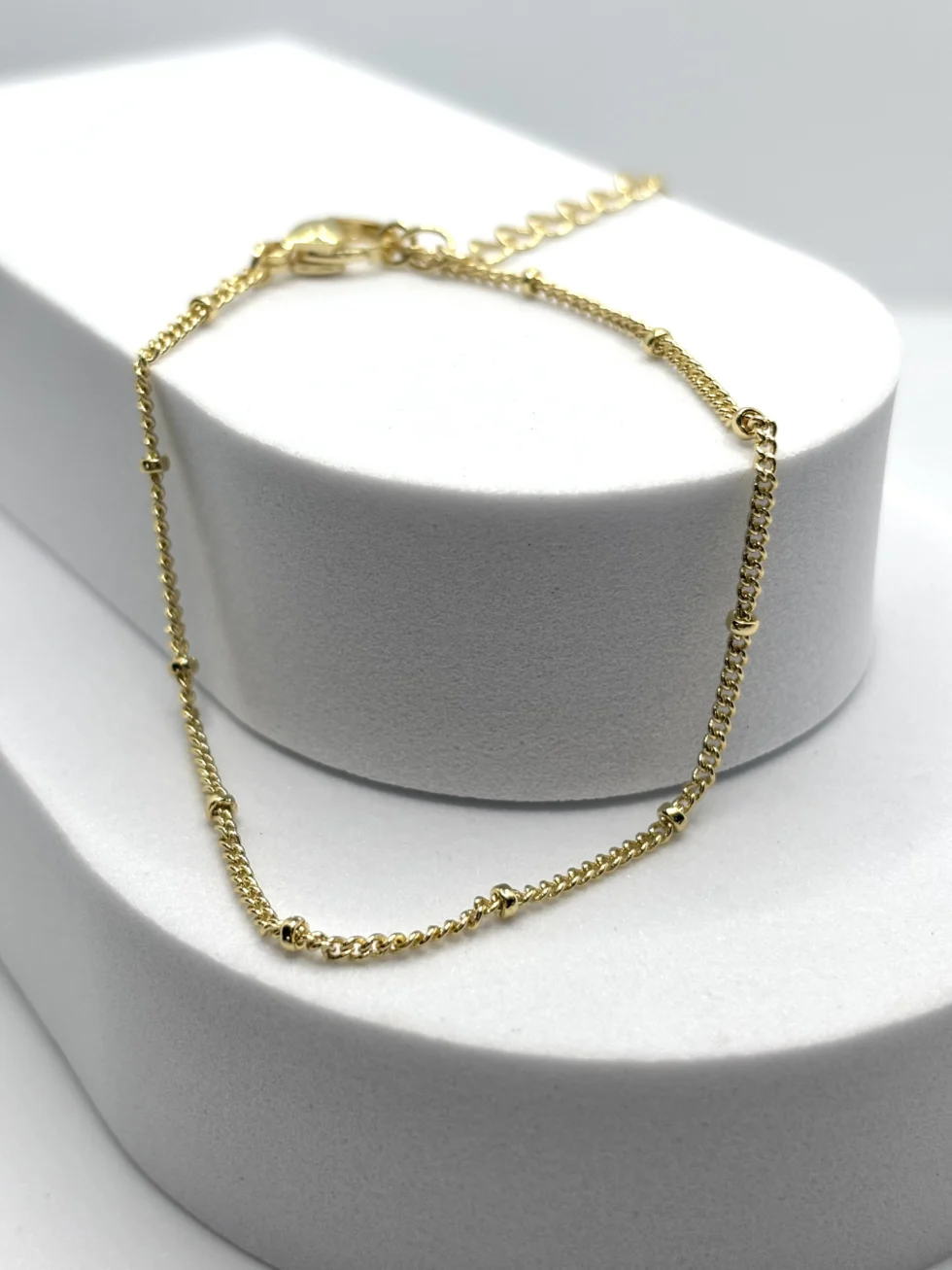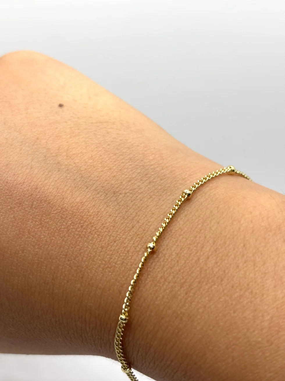 Bracciale a catena fine con micro sfere decorative in acciaio inox dorato. Un design minimal e luminoso che aggiunge un tocco di eleganza discreta ad ogni look.