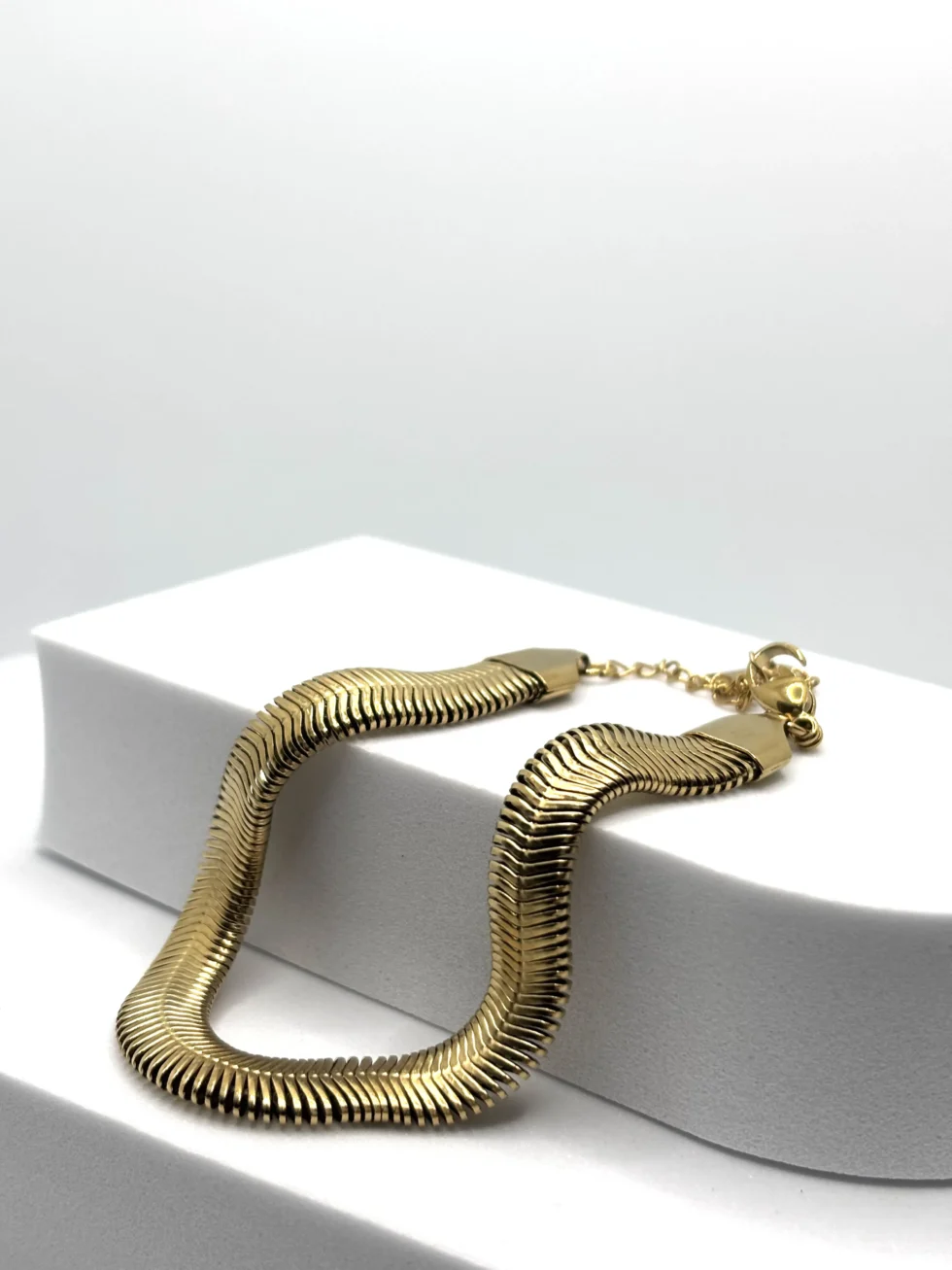 Bracciale dorato in acciaio inox con design a onde piatte. Un gioiello moderno e luminoso, pensato per chi ama distinguersi con dettagli raffinati.