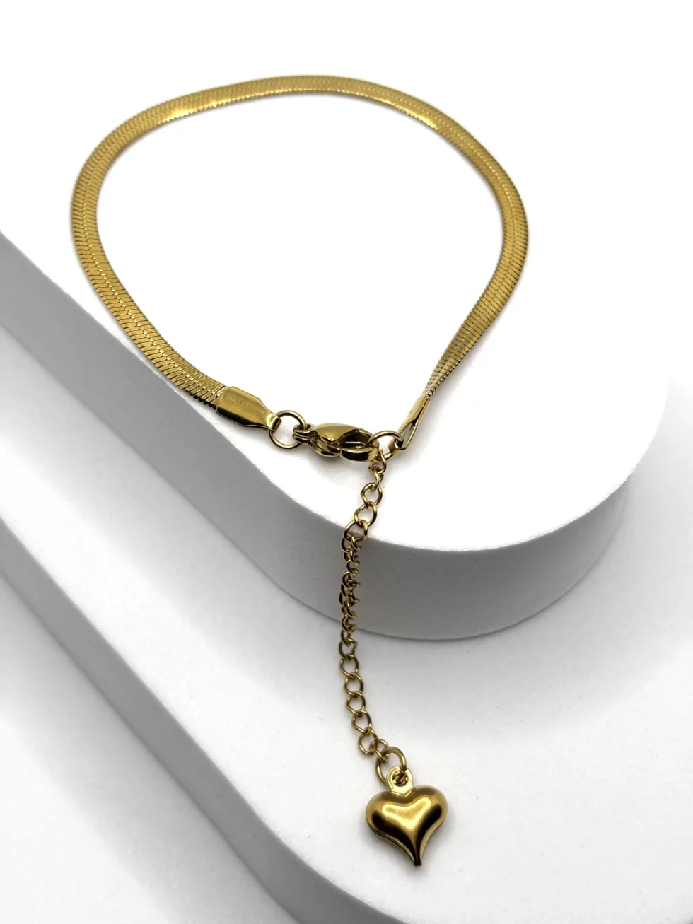 Bracciale snake chain in acciaio inox dorato con charm pendente a cuore bombato. Un accessorio raffinato che richiama eleganza e femminilità.