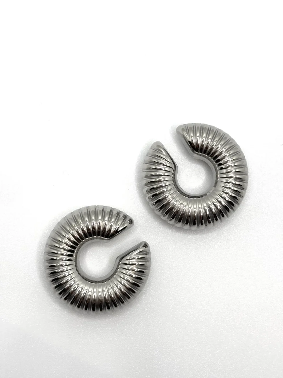 Ear cuff dal design bold e scanalato, realizzato in acciaio inox placcato oro o argento. Un gioiello moderno e deciso, che avvolge l’orecchio con carattere senza bisogno di fori.