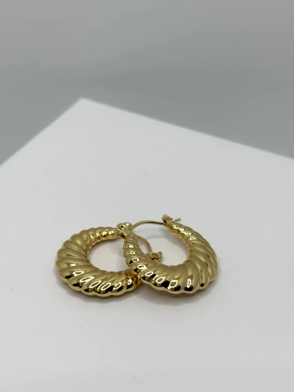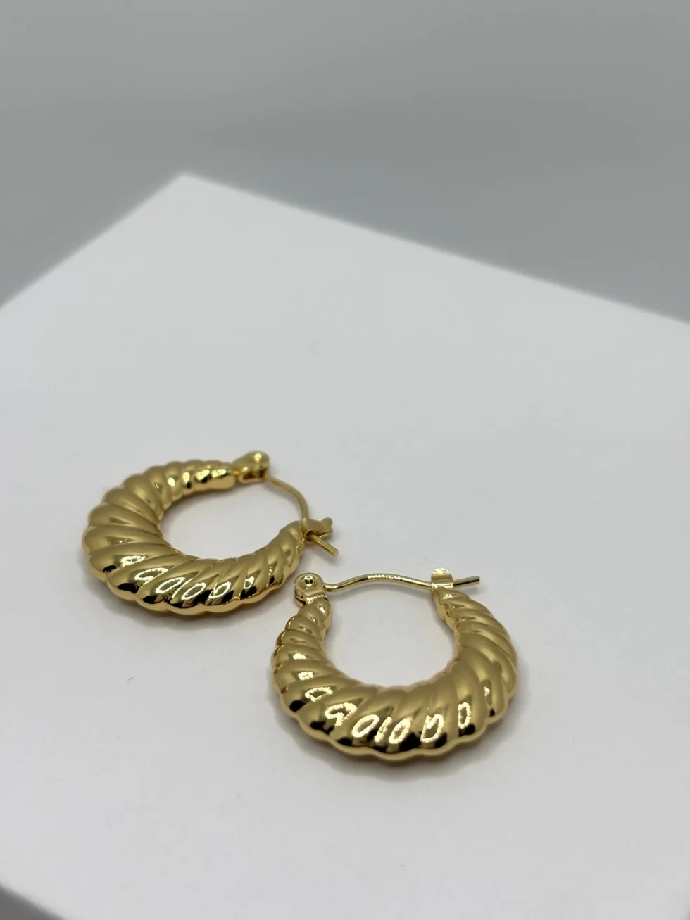 Orecchini a cerchio bombato in acciaio inox dorato, con superficie rigata che richiama le conchiglie marine. Eleganti e originali, ideali per dare luce e personalità a ogni look.