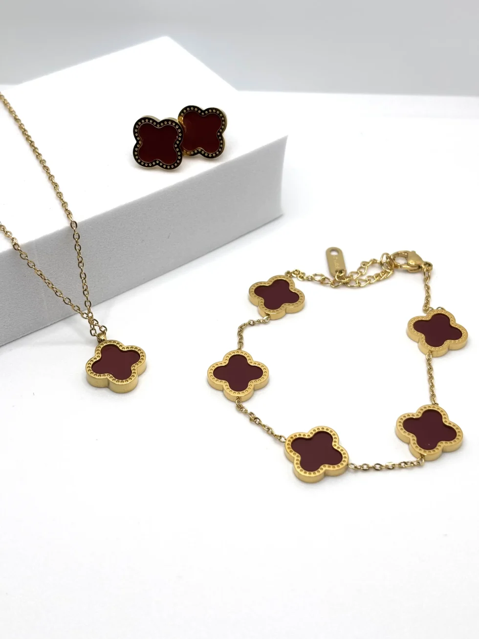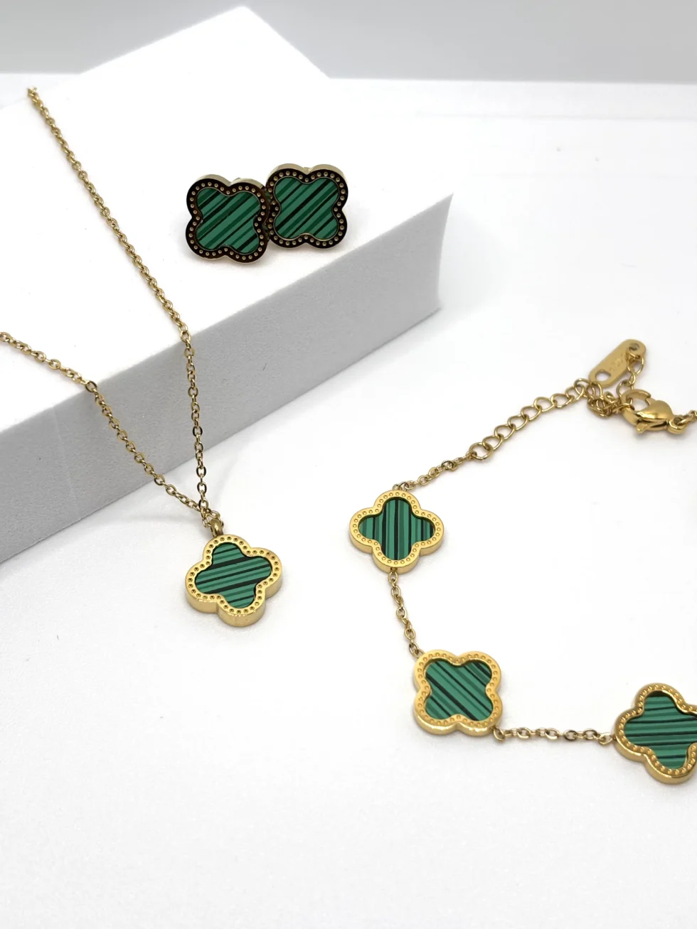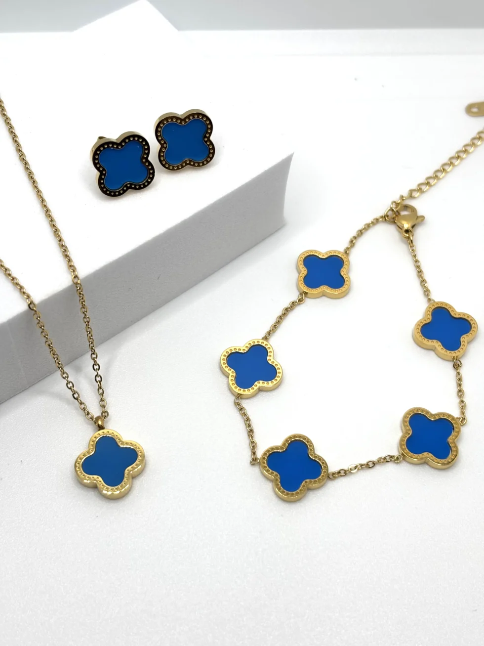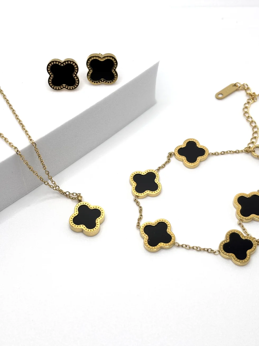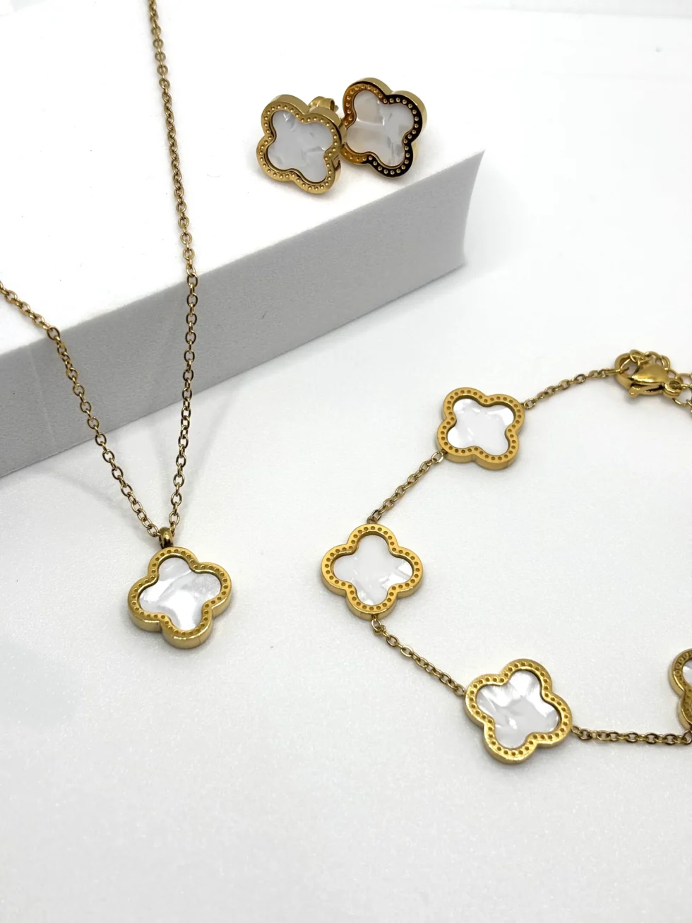 Set coordinato di collana, bracciale e orecchini a quattro petali in acciaio inox dorato. Un design raffinato e intramontabile, simbolo di armonia e femminilità.